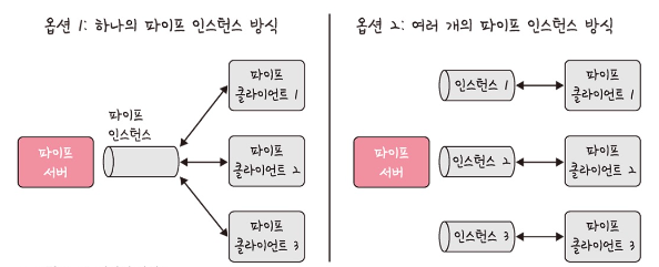 - 명명 파이프 : 파이프 서버와 하나 이상의 파이프 클라이언트 간의 통신을 위한 명명된 단방향 또는 이중 파이프를 말하며, 클라이언트와 서버간 통신을 위한 별도 파이프를 제공하며 여러 파이프를 동시에 사용할 수 있습니다. 컴퓨터의 프로세스끼리와 다른 네트워크상의 컴퓨터와도 통신할 수 있습니다.