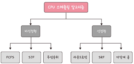 프로그램이 실행될 때 CPU 스케줄링 알고리즘이 어떤 프로그램에 CPU소유권을 줄것인지 결정하며 이 알고리즘은 CPU이용률은 높게, 주어진 시간에 많은 일을 하게, 준비 큐(ready queue)에 있는 프로세스는 적게, 응답 시간은 짧게 설정하는 것을 목표로 합니다.