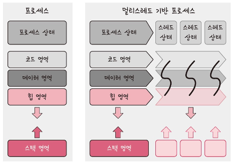 스레드는 프로세스의 실행 가능한 가장 작은 단위로 프로세스는 여러 스레드를 가질 수 있습니다.
