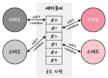 세마포어는 상호배제와 함께 프로세스나 스레드간의 동기화를 위한 도구중 하나로 세마포어는 정수형 변수로 구성되며, wait(P)와 signal(V)이라는 함수로 제공합니다.