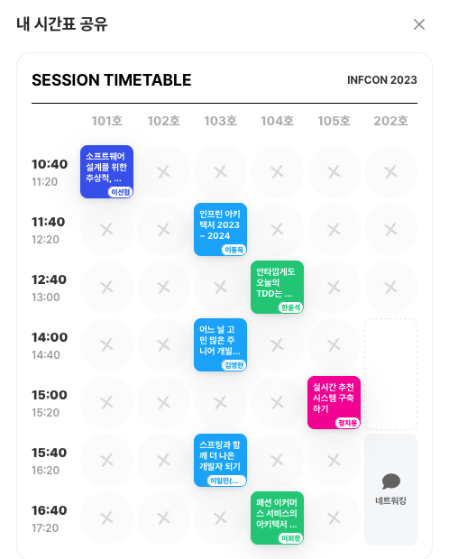 인프콘행사 시간표 를 보고 내가 원하는 세션을 담아 나만의 시간표를 만들면 됩니다.