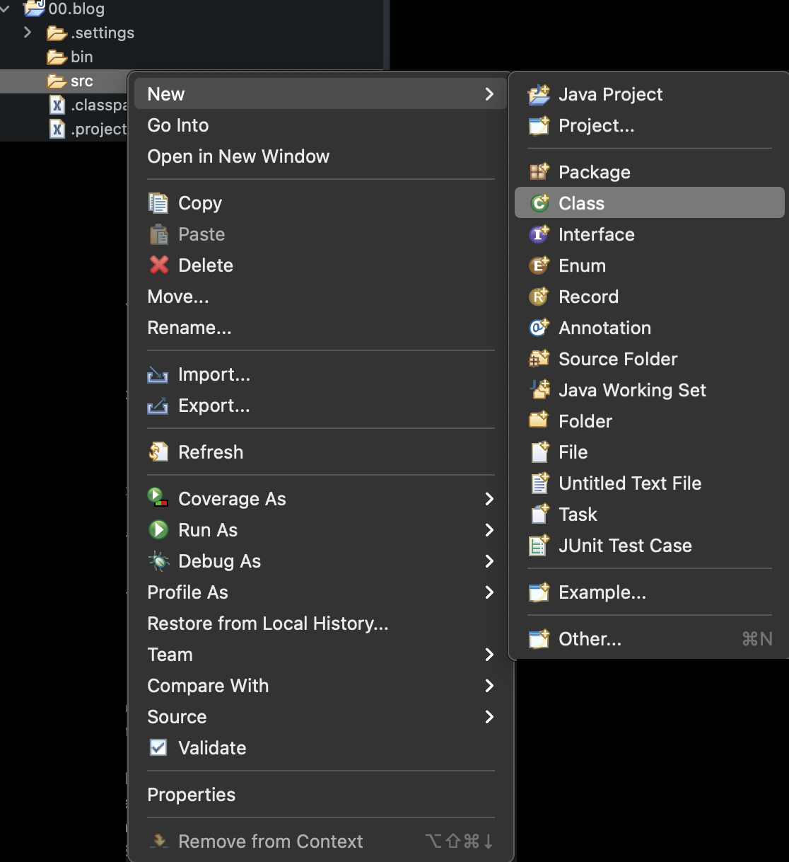 우클릭 -> New -> Class 를 통해 클래스파일을 생성해줍시다.