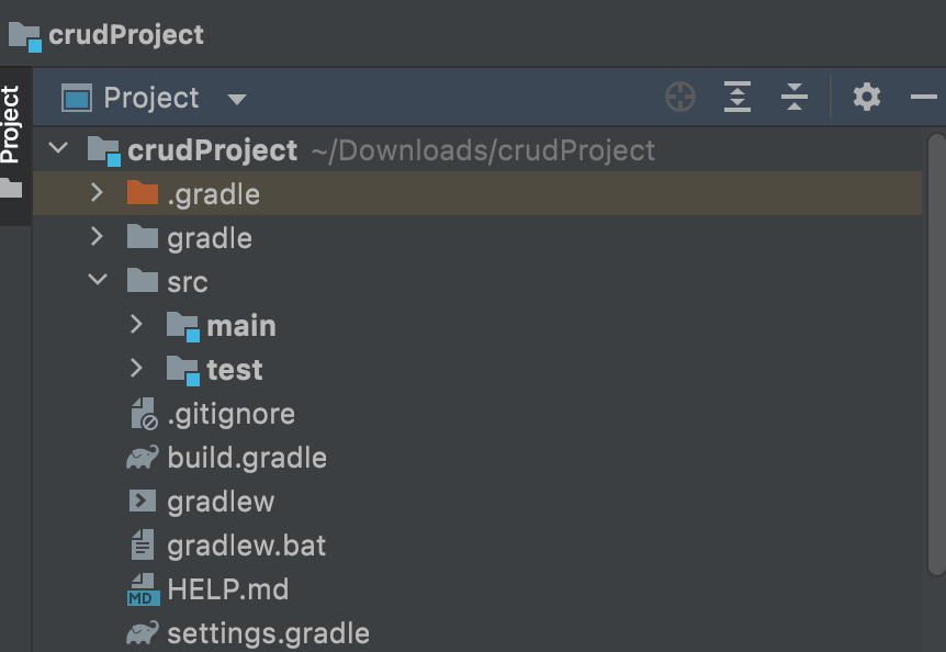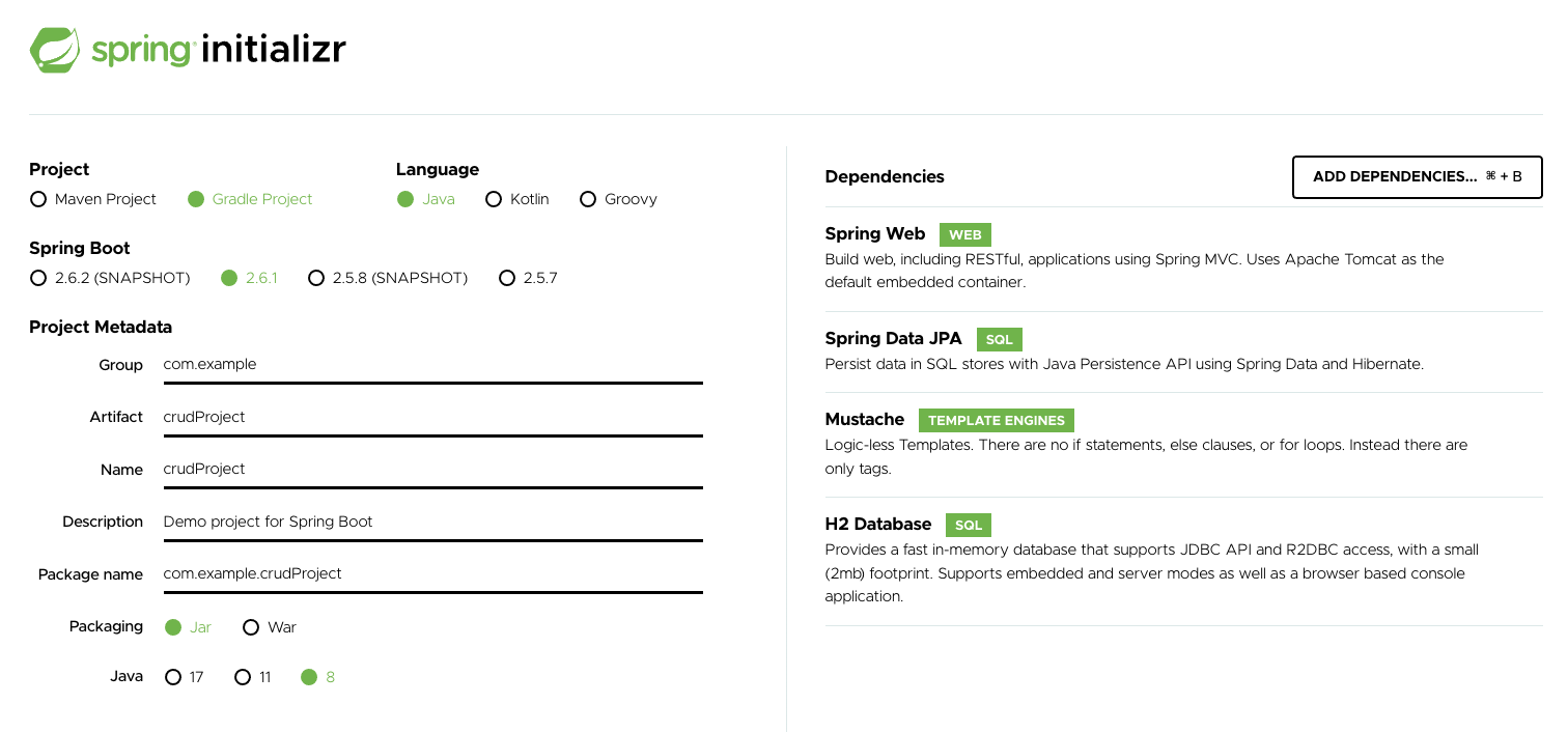 Project Metadata -> Artifact : crudProject 로 프로젝트명을 명명