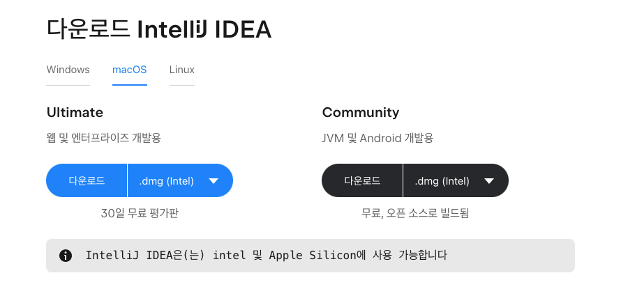 https://www.jetbrains.com/ko-kr/idea/download/#section=mac