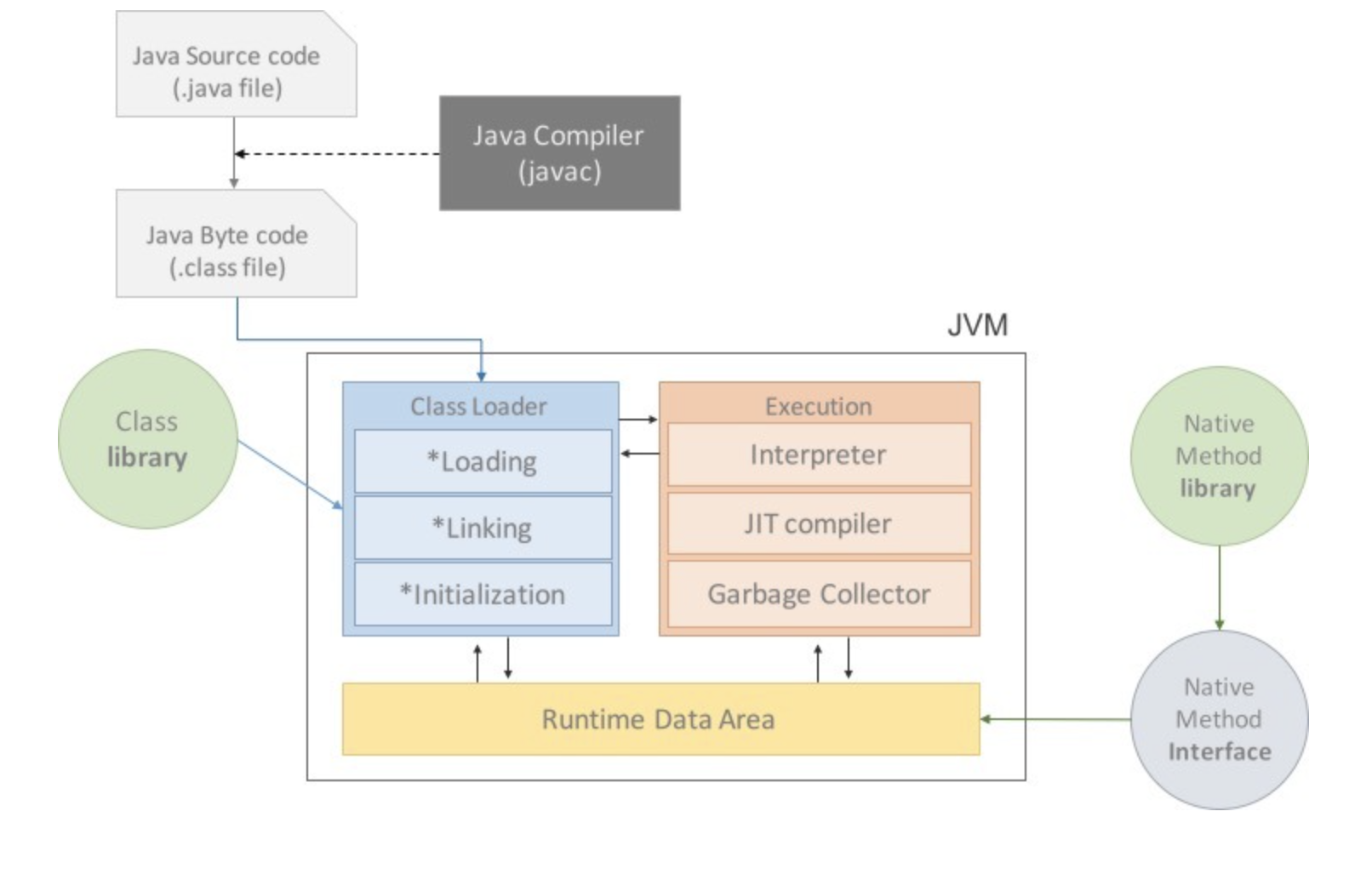 - 클래스 로더(class loader) : 자바는 동적으로 클래스를 읽어오므로, 프로그램이 실행중인 런타임때서야 모든 코드가 JVM과 연결됩니다. 이렇게 동적으로 클래스를 로딩하게 해주는 역할입니다.