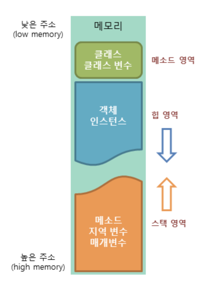 - 힙(heap) 영역 : 자바 프로그램에서 모든 인스턴스 변수가 저장되는 영역입니다. JVM은 자바 프로그램에서 new 키워드를 사용해 인스턴스가 생성되면 해당 정보를 힙 영역에 저장합니다. 힙 영역은 메모리의 낮은 주소에서 높은 주소의 방향으로 할당됩니다.