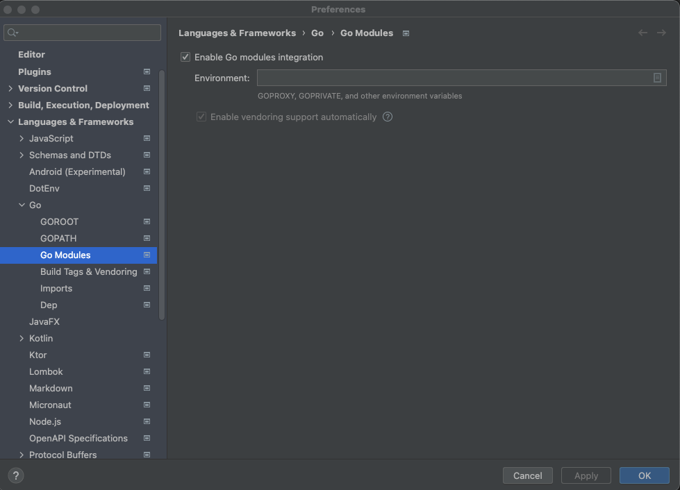 GO - Go Modules - Enable Go modules integration 에 v 체크해서 해결하였습니다.