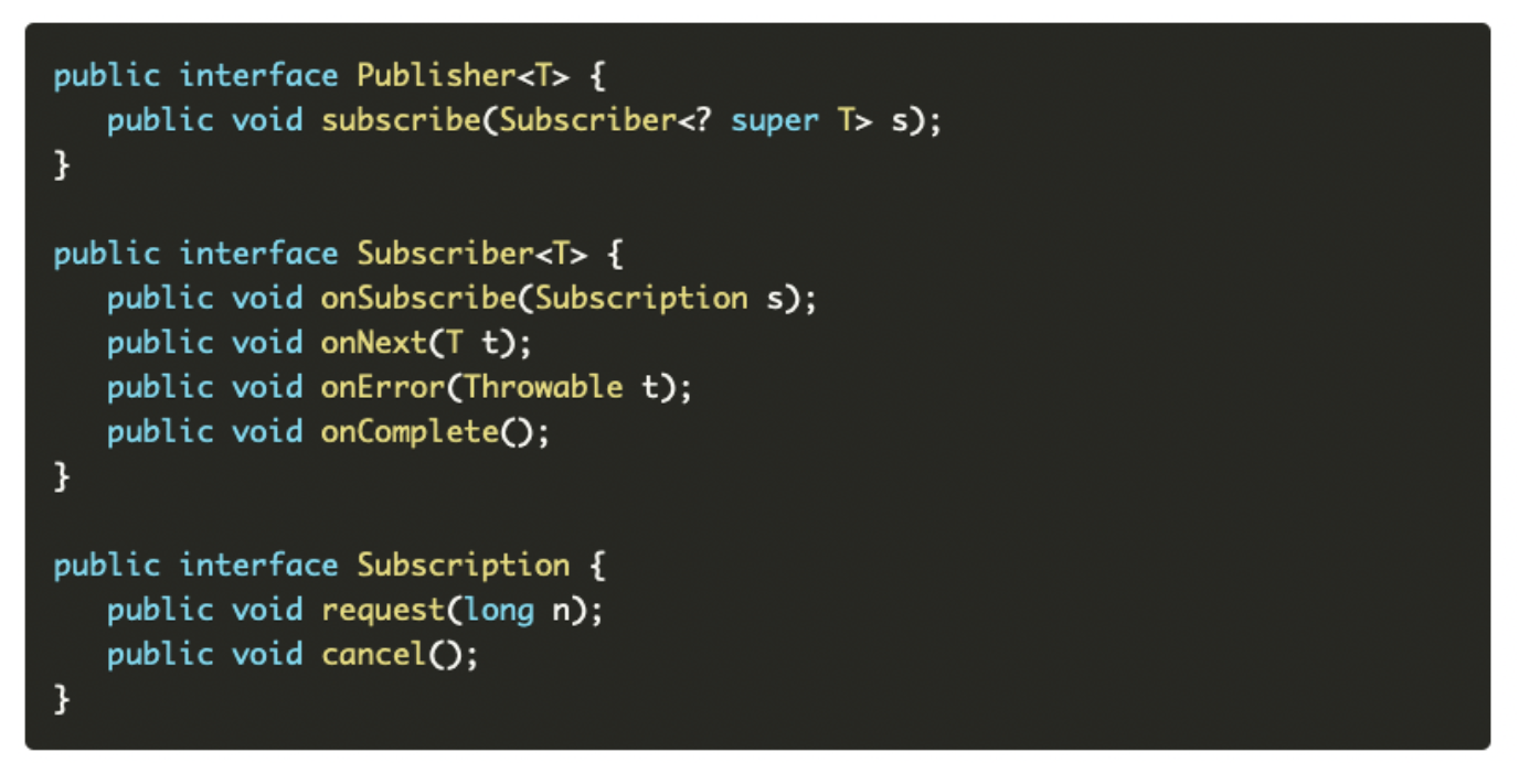 - Publisher는 Subscription 을 통해 Subscriber의 onNext에 데이터를 전달하고 정상적으로 작업이 완료되면 onComplete,