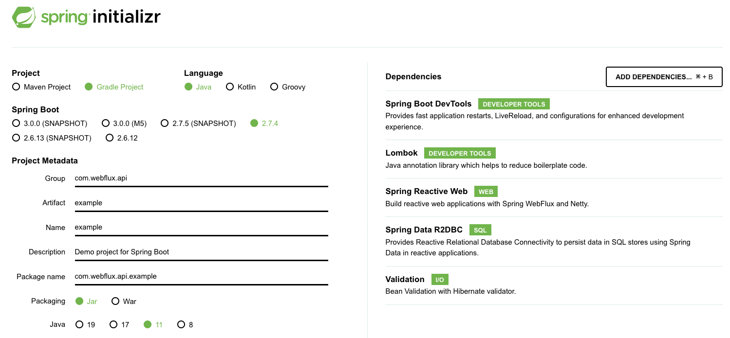 큰 항목은 이렇게 설정했으며, Gradle dependencies 에 r2dbc-mysql connection은 따로 입력해주세요.