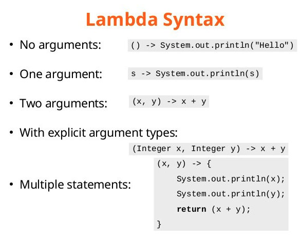 먼저 람다식(Lambda Expressions)은 JDK 8 버전에서 추가된 기능으로 함수형 프로그래밍에서 보이는 arrow(화살표) 식으로 표현되는 문법으로 함수의 흐름을 명확하고 간결하게 표현하는 특징이 있습니다. 보통 데이터를 추출할 때 반복되거나 필터링이 필요할 경우 자주 사용됩니다. Java 에서 람다식은 함수로 취급되기 때문에 컴파일러가 .class 파일을 생성하지 않는다는 특징이 있습니다.