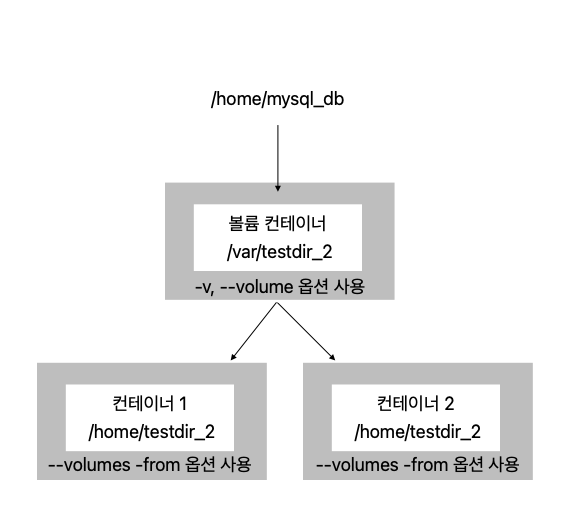 - 볼륨 컨테이너 : -v 옵션으로 볼륨을 사용하는 컨테이너를 다른 컨테이너와 공유하는 것 입니다. 컨테이너를 생성할 때 --volumes -from 옵션을 설정하면 -v & --volume 옵션을 적용한 컨테이너의 볼륨 디렉터리를 공유할 수 있습니다. 하지만 이 공유는 직접 볼륨을 공유하는게 아니라 -v 옵션을 적용한 컨테이너를 통해 공유하는 것 입니다.