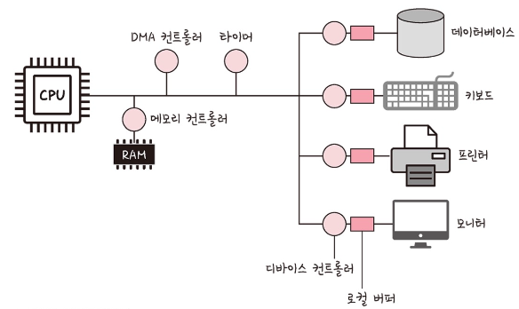 - 디바이스 컨트롤러 : 컴퓨터와 연결되어 있는 IO 디바이스의 작은 CPU를 말합니다.