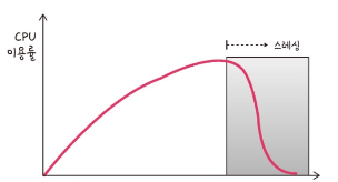 메모리에 너무 많은 프로세스가 동시에 올라가게 되면 스와핑이 많이 일어나서 발생하는 것으로 페이지 폴트가 일어나면 CPU 이용률이 낮아지고, 운영체제는 낮은 이용률을 보고 가용성을 높이기 위해 더 많은 프로세스를 메모리에 올리게 됩니다. 이를 해결하기 위해선 메모리를 늘리거나, HDD를 사용한다면 SDD로 교체하는 방법등이 있고 운영체제에서 이를 해결하려면 ‘작업 세트’ 와 ‘PFF’가 있습니다.