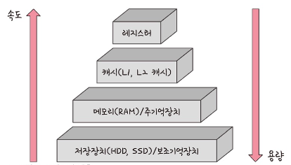 - 캐시 : 데이터나 명령어등에 빠르게 접근하기 위해 CPU와 메인 메모리 사이에 위치한 일종의 임시저장소로 L1, L2 캐시를 지칭하며 휘발성 메모리로 속도가 빠르나 역시 용량이 적다.