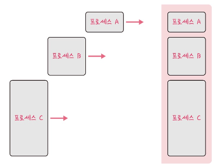 - 연속 할당 : 메모리에 ‘연속적’으로 공간을 할당하는 것입니다. 아래 처럼 순차적으로 공간에 할당할 때 메모리를 미리 나누어 관리하는 ‘고정 분할 방식’과 매 시점 프로그램에 크기에 맞게 메모리를 분할하는 ‘가변 분할 방식’이 있습니다.